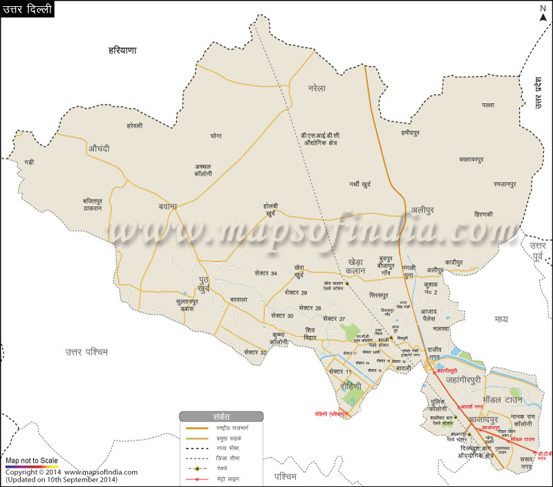 * ऊपर दिया हुआ उत्तरी दिल्ली जिले का नक्शा (मानचित्र) राष्ट्रीय राजमार्ग, सड़क, रेलवे, नदी, जिला मुख्यालय, जिला सीमा, प्रमुख शहरों और गांवों को दर्शाता है|
