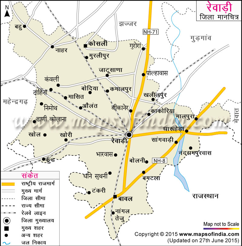* ऊपर दिया हुआ रेवाड़ी जिले का नक्शा (मानचित्र) राष्ट्रीय राजमार्ग, सड़क, रेलवे, नदी, जिला मुख्यालय, जिला सीमा, प्रमुख शहरों और गांवों को दर्शाता है|