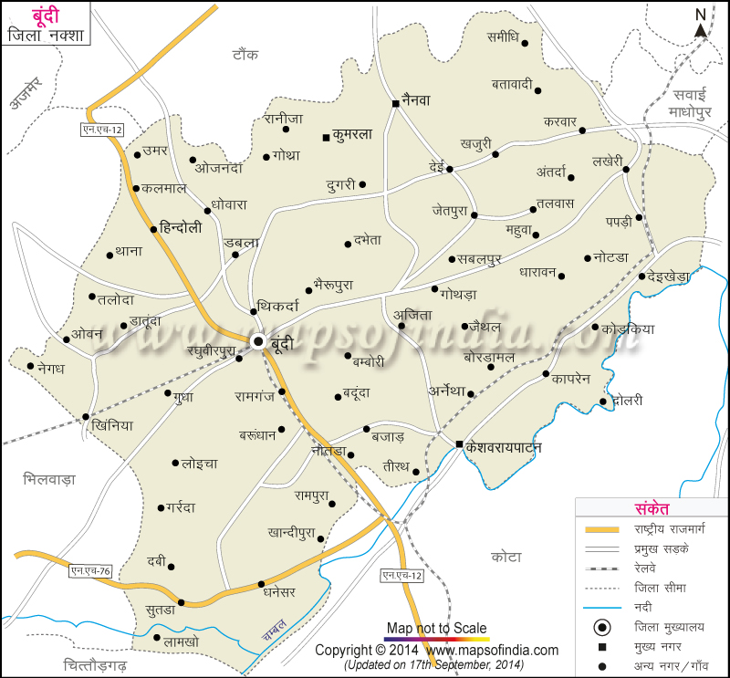 * ऊपर दिया हुआ बूंदी जिले का नक्शा (मानचित्र) राष्ट्रीय राजमार्ग, सड़क, रेलवे, नदी, जिला मुख्यालय, जिला सीमा, प्रमुख शहरों और गांवों को दर्शाता है|