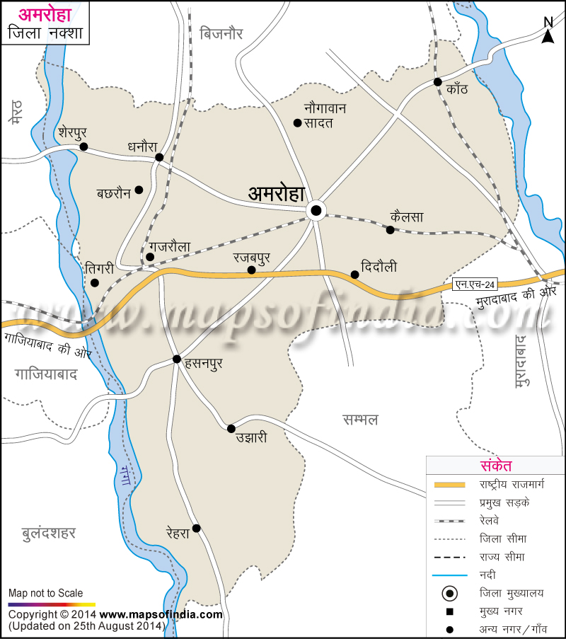 ऊपर दिया हुआ अमरोहा जिले का नक्शा (मानचित्र) राष्ट्रीय राजमार्ग, सड़क, रेलवे, नदी, जिला मुख्यालय, जिला सीमा, प्रमुख शहरों और गांवों को दर्शाता है|