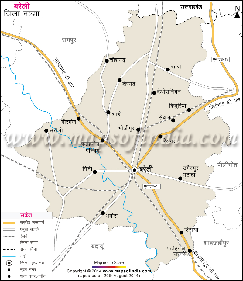 ऊपर दिया हुआ बरेली जिले का नक्शा (मानचित्र) राष्ट्रीय राजमार्ग, सड़क, रेलवे, नदी, जिला मुख्यालय, जिला सीमा, प्रमुख शहरों और गांवों को दर्शाता है|