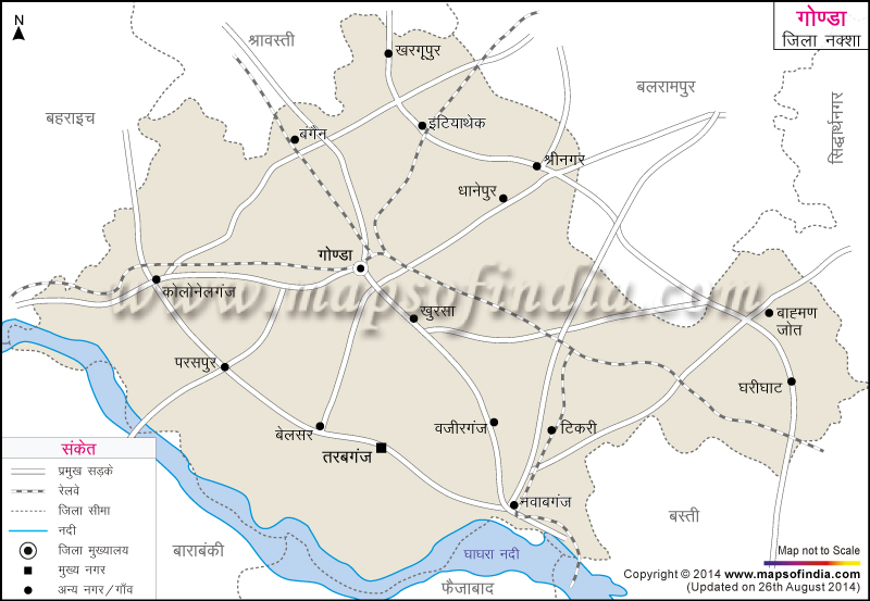 ऊपर दिया हुआ गोंडा जिले का नक्शा (मानचित्र) राष्ट्रीय राजमार्ग, सड़क, रेलवे, नदी, जिला मुख्यालय, जिला सीमा, प्रमुख शहरों और गांवों को दर्शाता है|